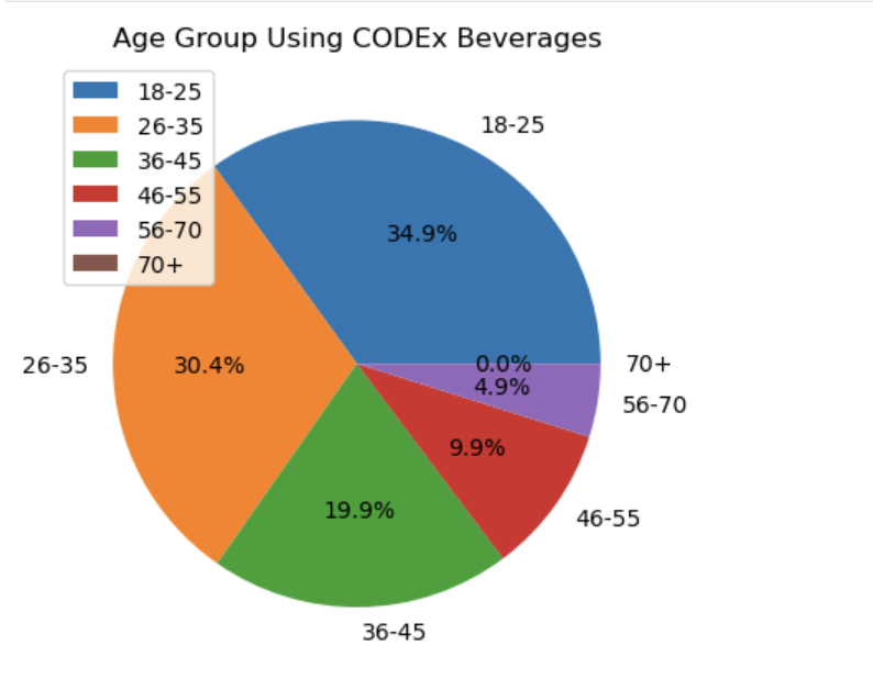 Distribution of respondent age groups. A majority (almost 65%) of respondents were under 35 years old, with about 35% in the 18–25 range and 30% in 26–35. Older age brackets taper off, as shown in the pie chart.