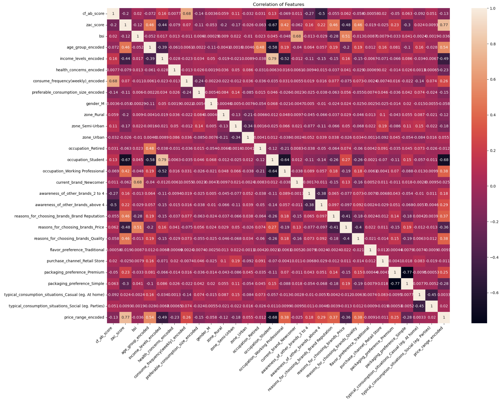 • One-Hot Encoding for Categorical Variables: The remaining categorical features (gender, occupation, current_brand, preferable_consumption_size, flavor_preference, purchase_channel, typical_consumption_situations, and the reasons for choosing brand) were nominal with no ordinal relation. I applied one-hot encoding to convert these into binary indicator columns. For example, gender became a column gender_M (1 for Male, 0 for Female), current_brand became current_brand_Newcomer (with Established as the reference category), occupations were split into dummy variables like occupation_Student, occupation_Retired, etc., and so on. We dropped one dummy from each set to avoid redundancy (e.g., for flavor preference, we drop “Exotic” and only keep a dummy for “Traditional” flavor). In total, after encoding and dropping unused original columns, I ended up with ~22 feature columns ready for modeling.